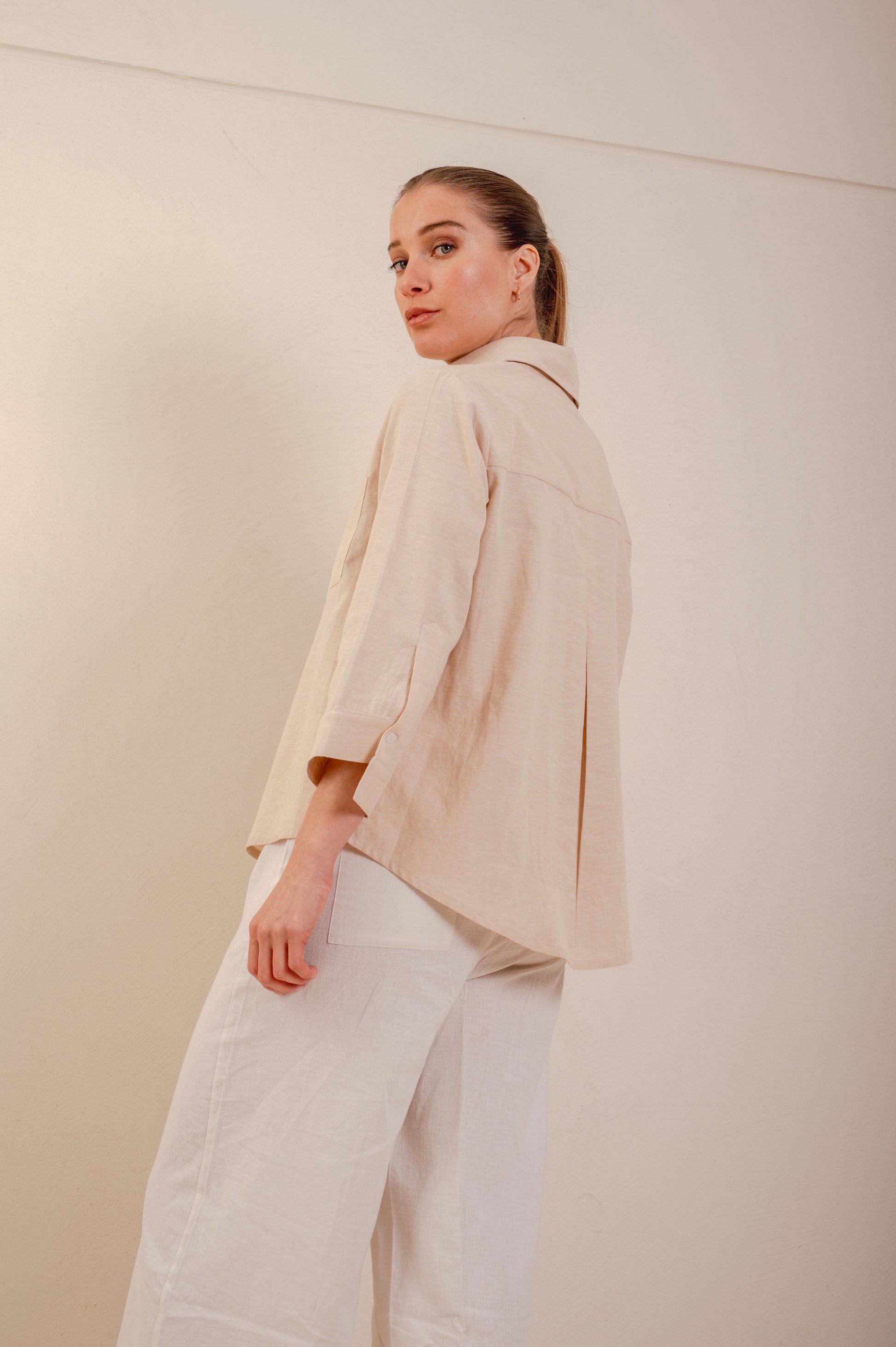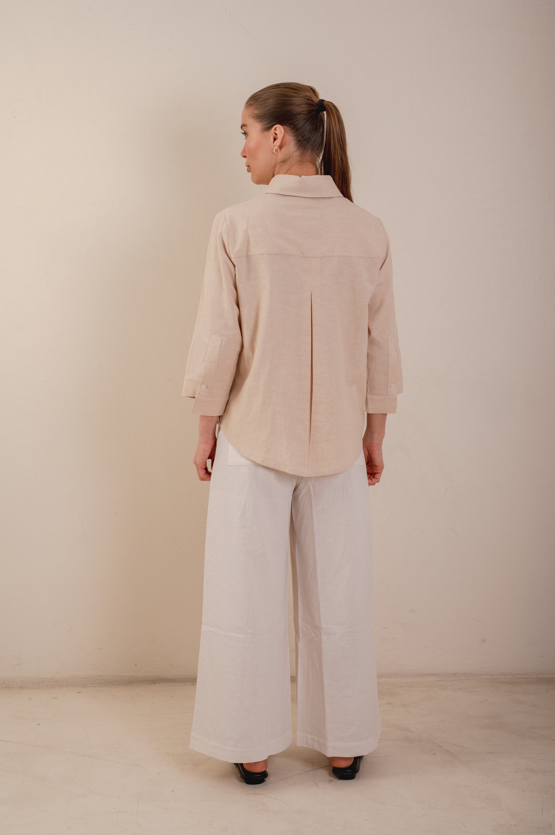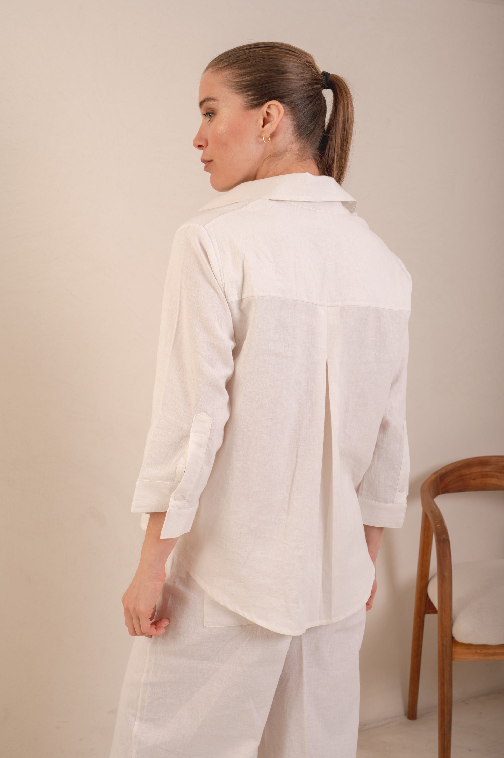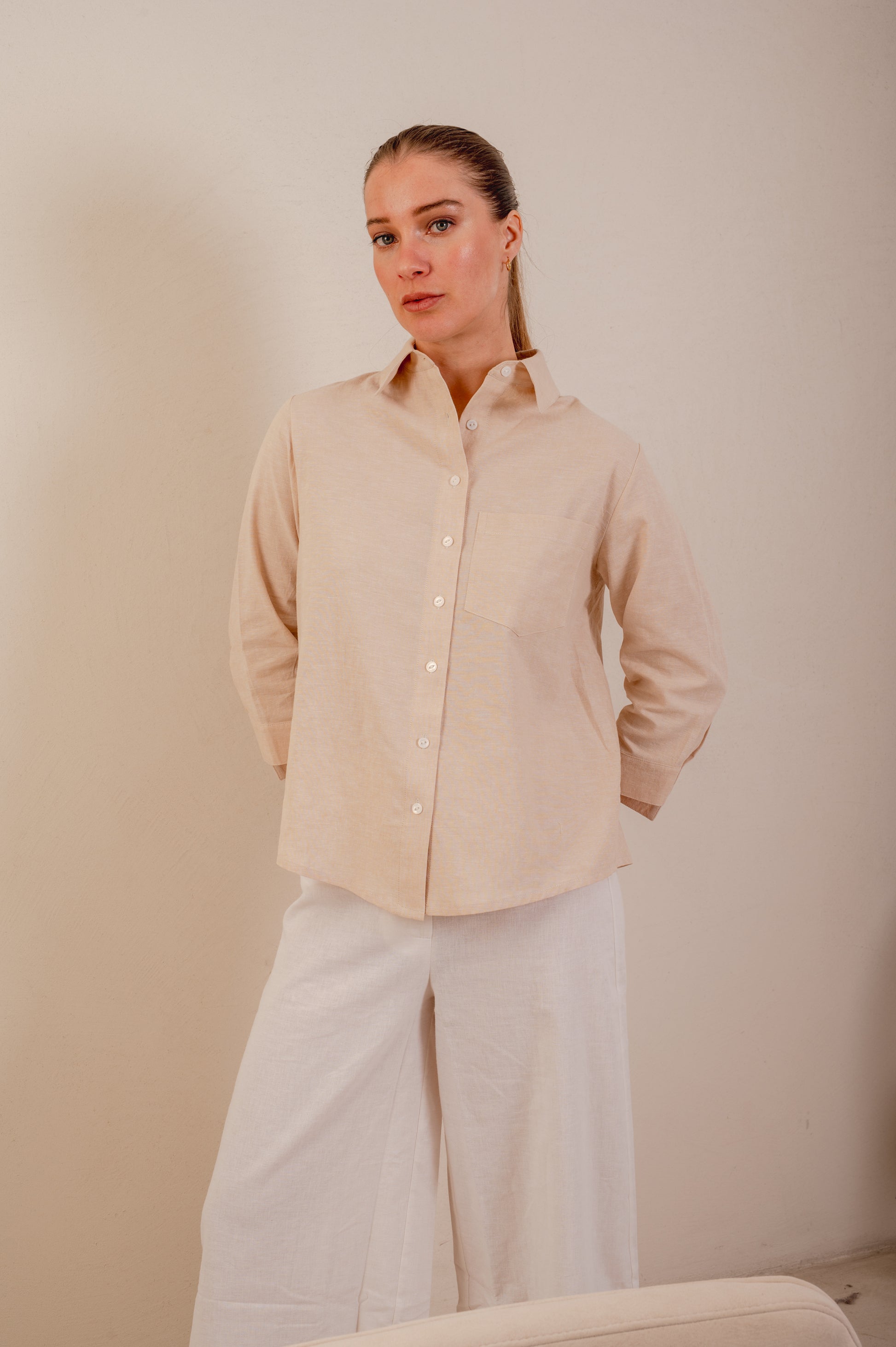 Camisa Lino. Mangas 3/4. Con botones delanteros de color. Diseño cómodo y fresco.