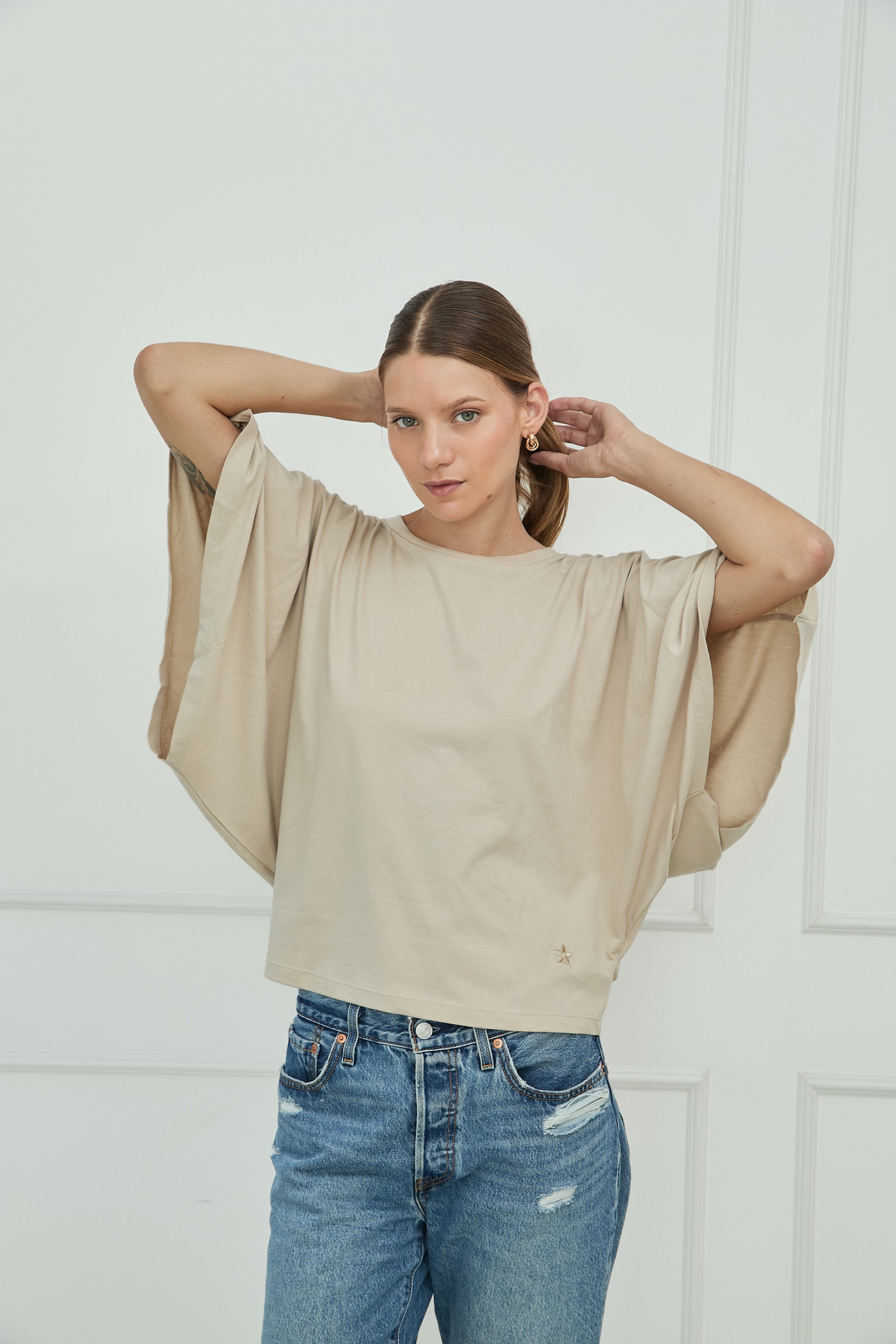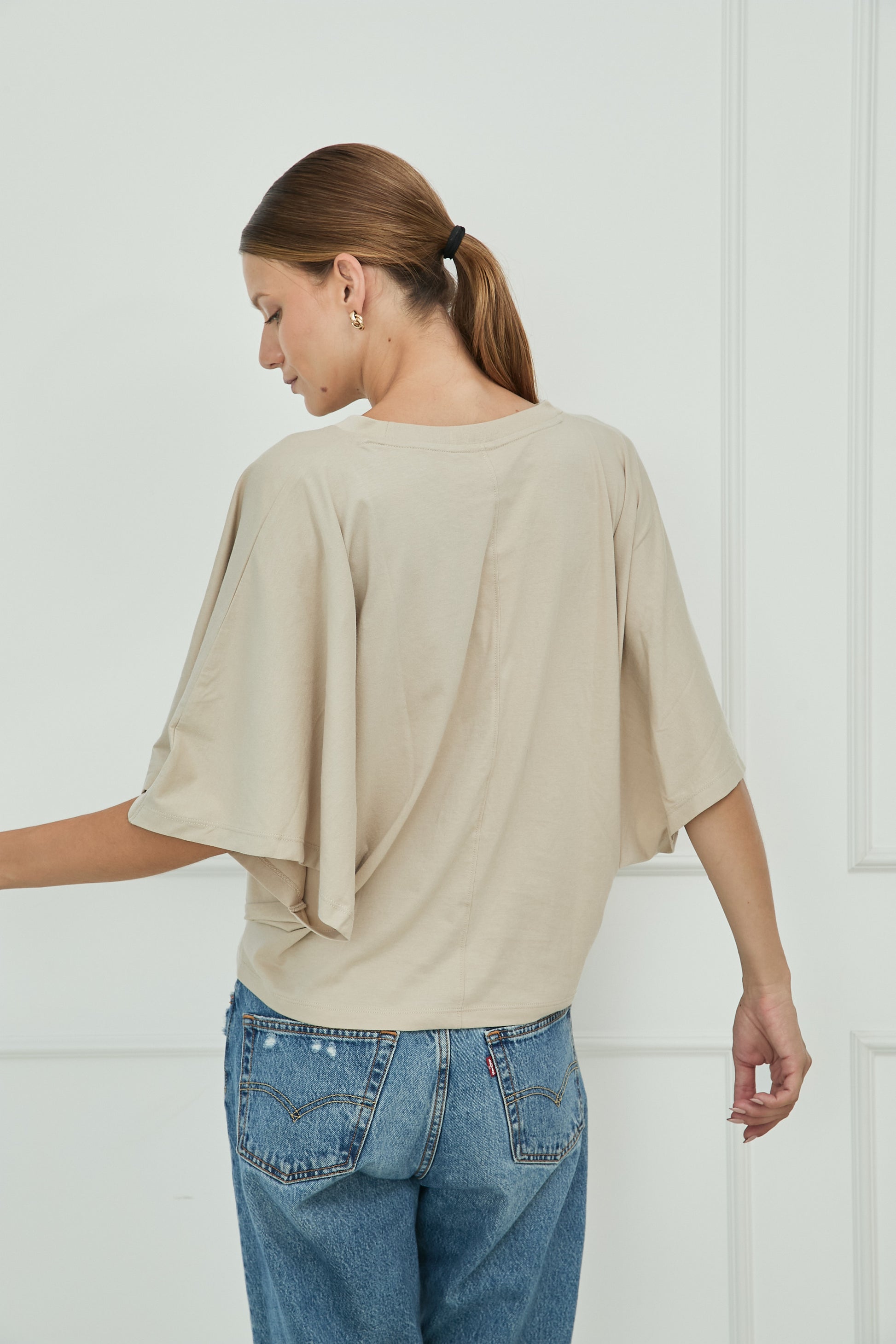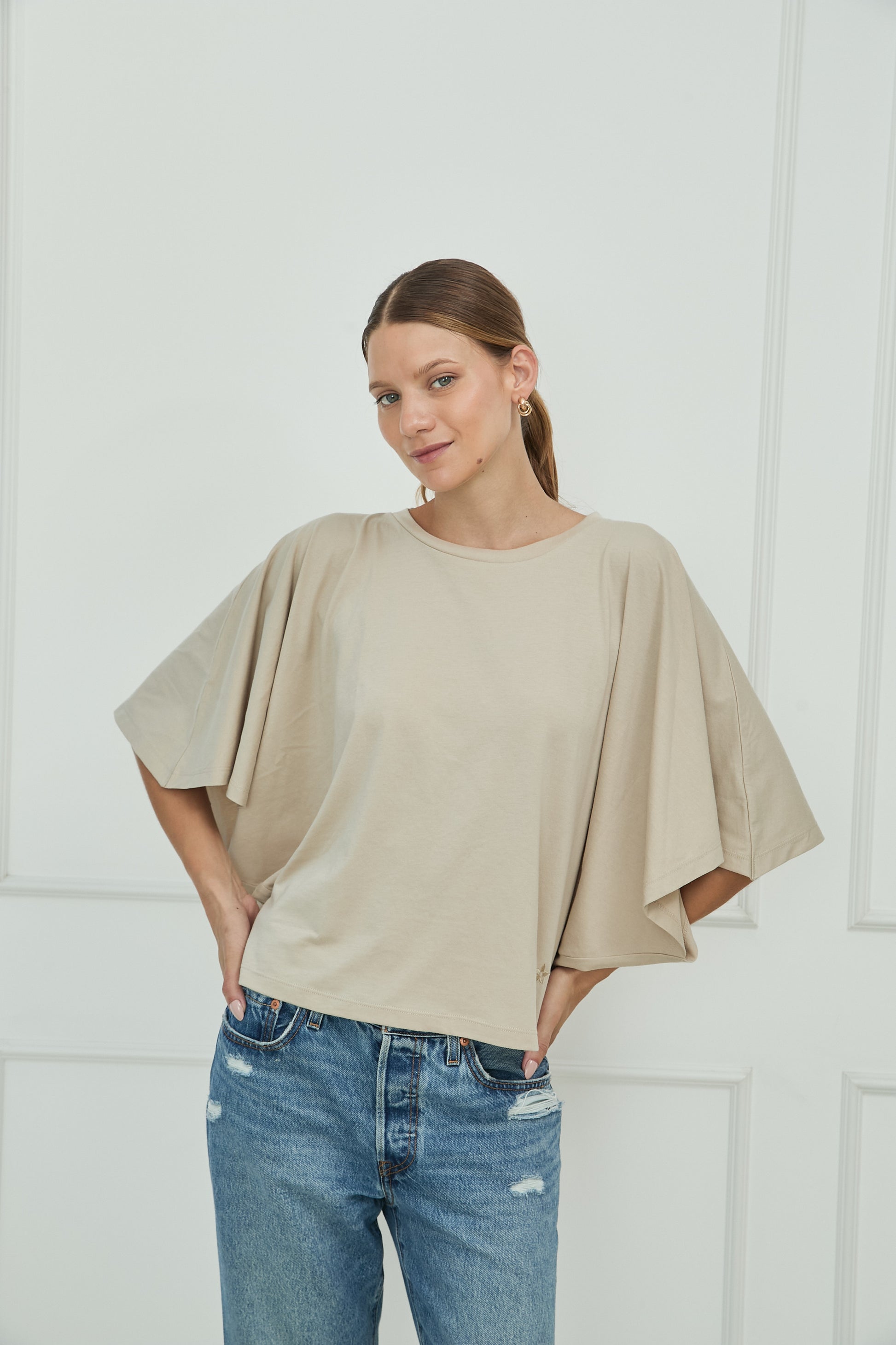 Diseño liso, fit regular. Camiseta tipo capa. Cuello Redondo. Manga Murcielago. Tiene un pequeño bordado de la marca en la parte inferior izquierda a tono de prenda. Disponible en 2 colores.