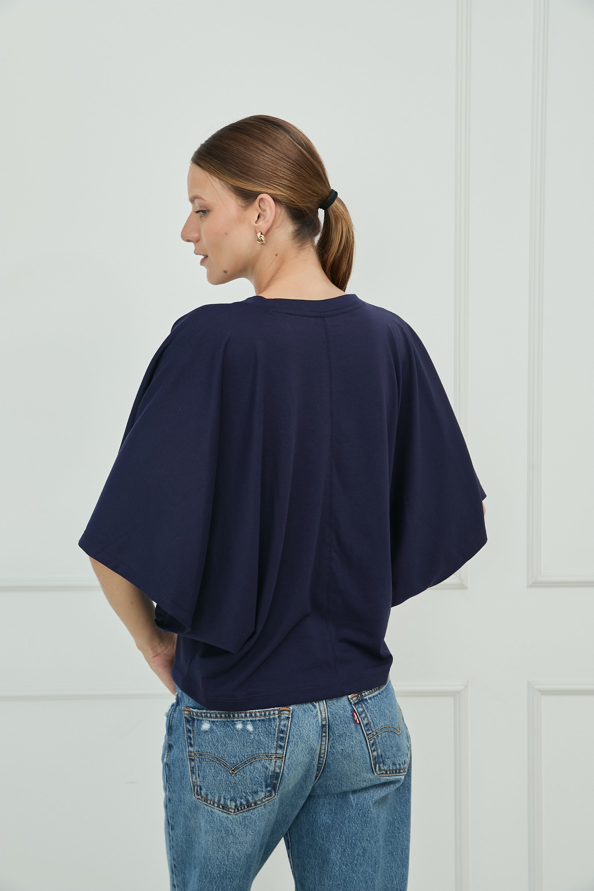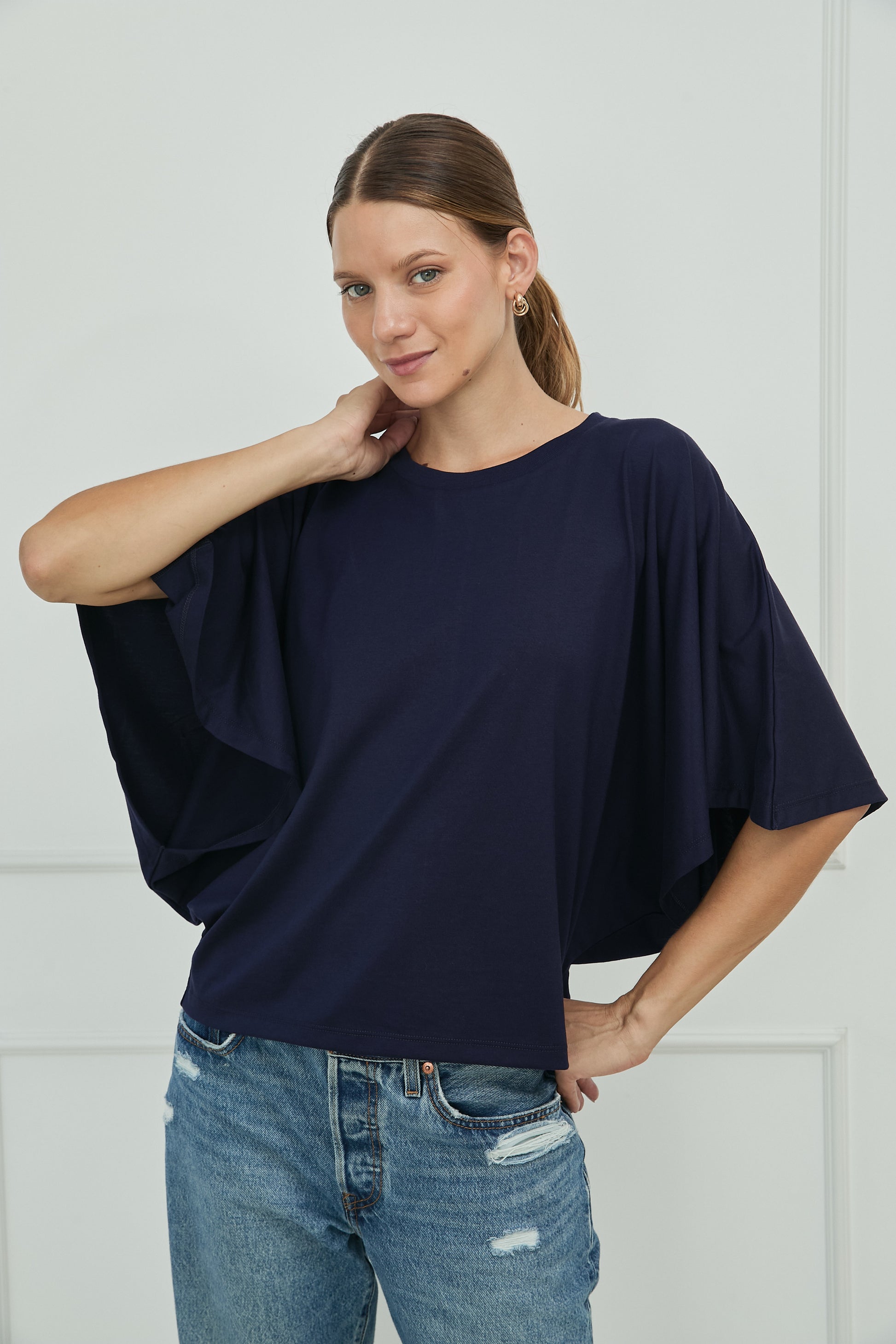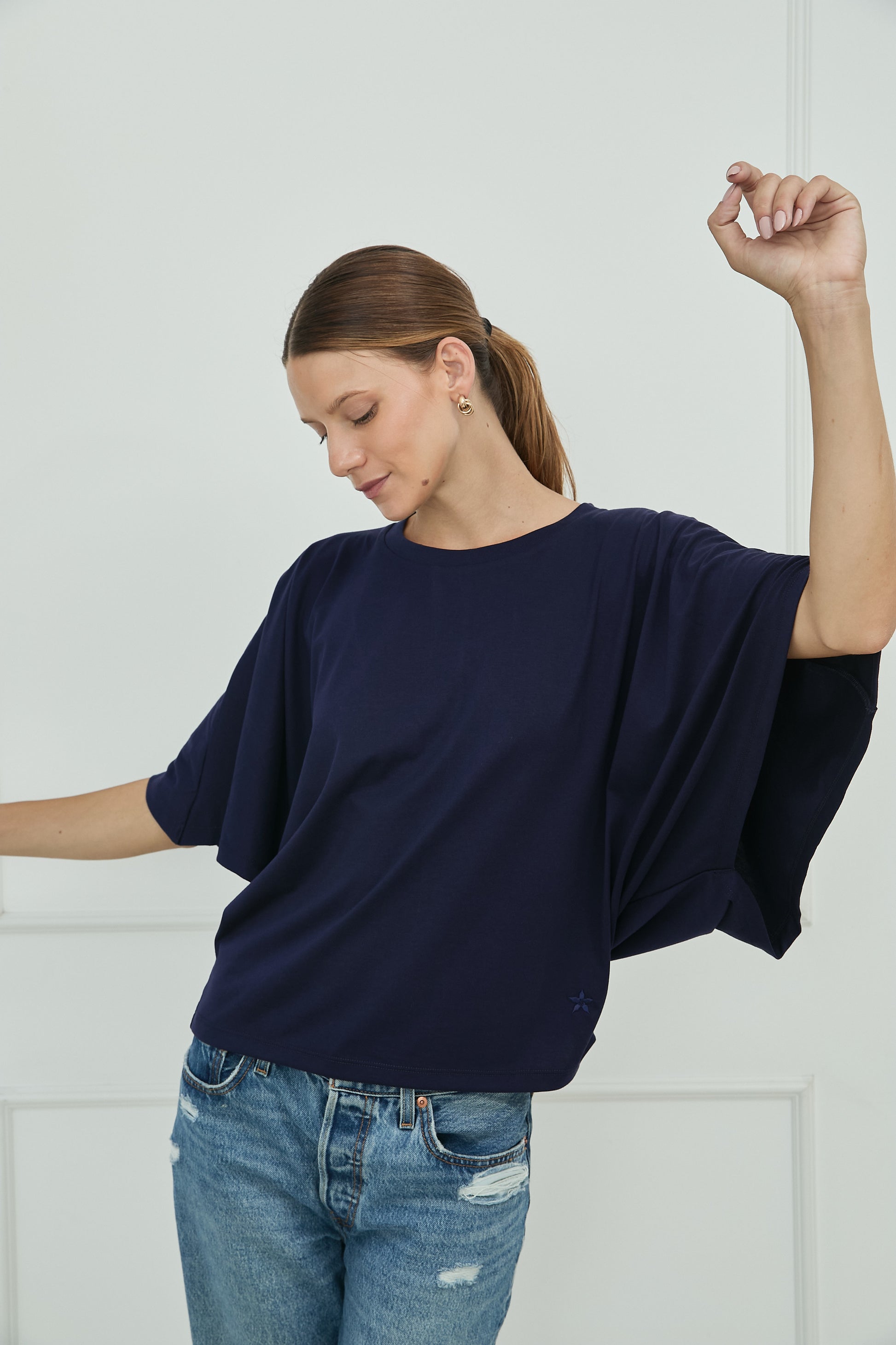 Diseño liso, fit regular. Camiseta tipo capa. Cuello Redondo. Manga Murcielago. Tiene un pequeño bordado de la marca en la parte inferior izquierda a tono de prenda. Disponible en 2 colores.